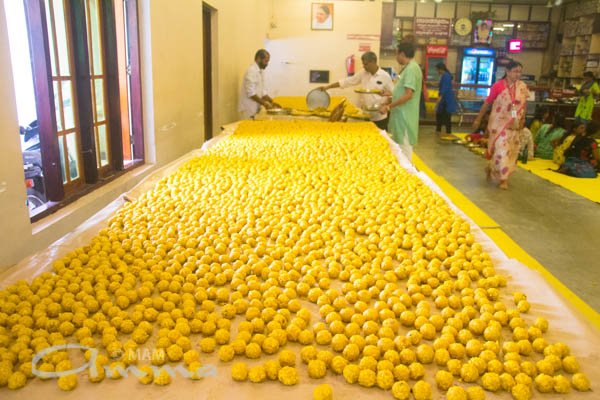 Laddu as prasad for Amma’s birthday distribution is being prepared by the the volunteers @Amritapuri