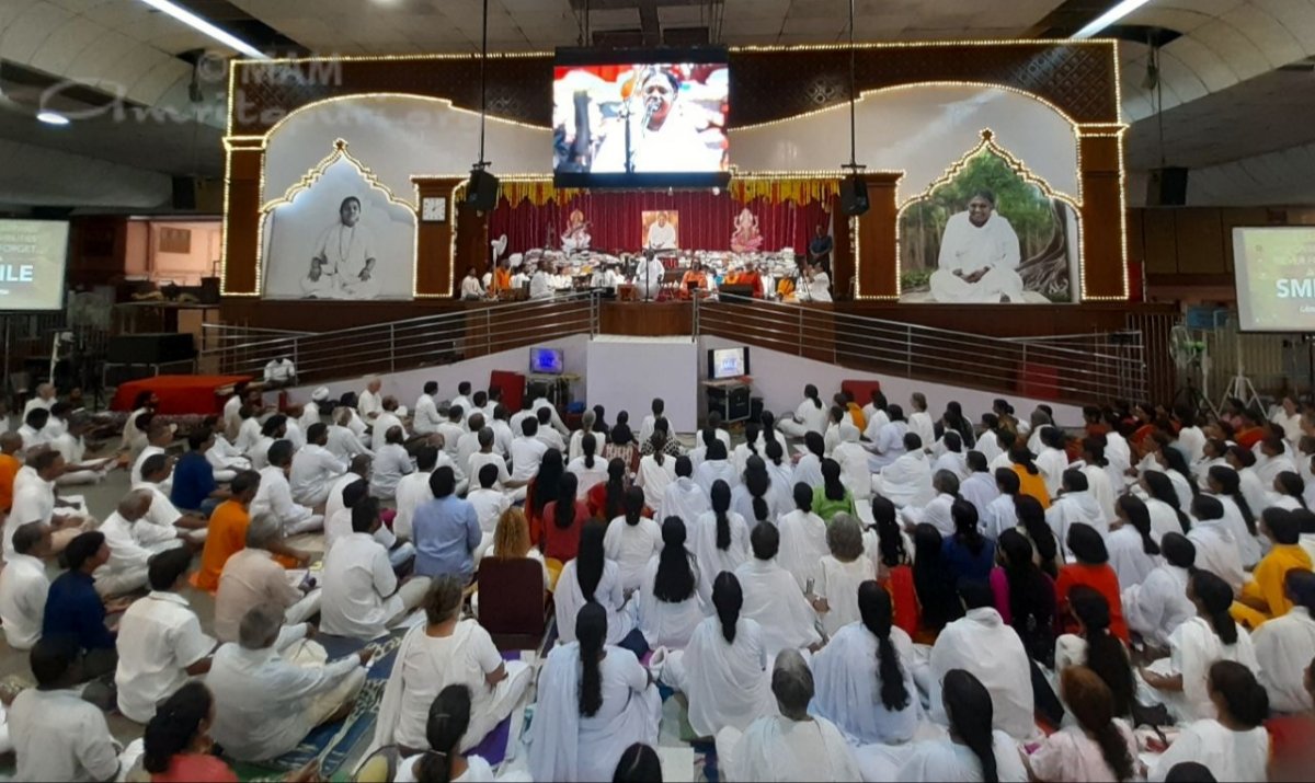 After singing “Hamsavahana Devi Amba Saraswati…” Amma now leading all in meditation and Manasapuja