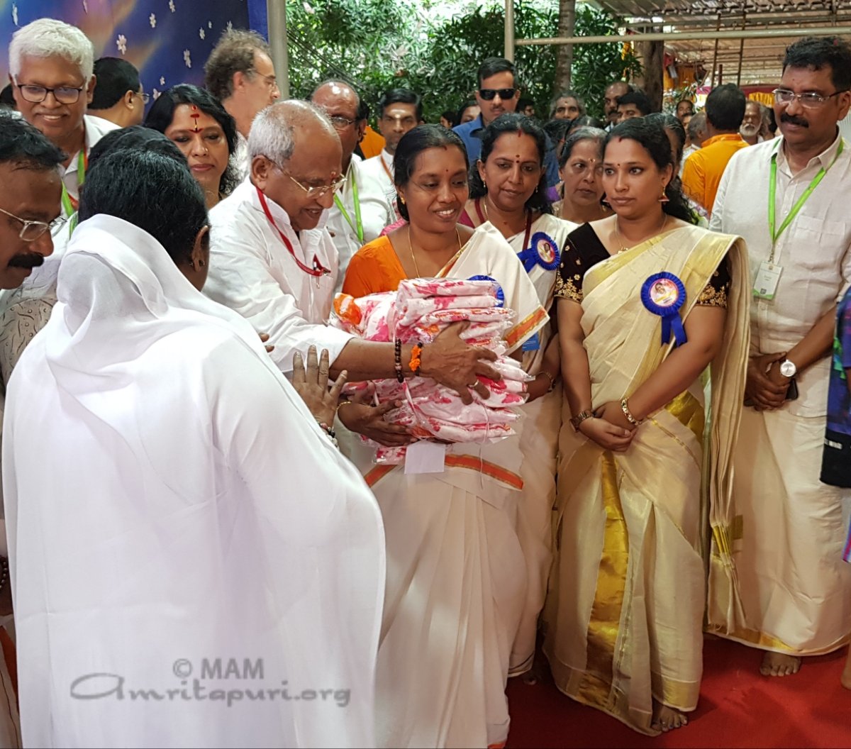 Amma giving saris to AmritaSREE Self-help Group members at Thiruvananthapuram Brahmasthanam Festival – #BharataYatra 2020 pic.twitter.com/kjJNvt7UeK