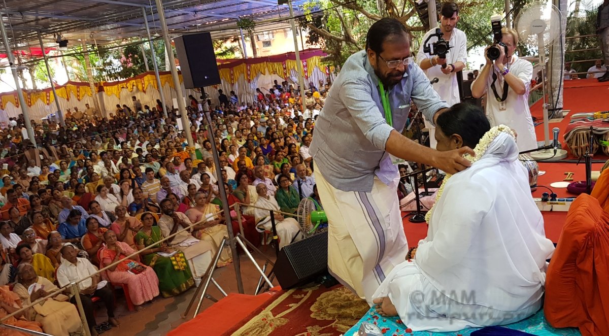 Amma arrived on the stage, Dignitaries garlanding Amma at Thiruvananthapuram Brahmasthanam Festival – #BharataYatra 2020 pic.twitter.com/pu5wTpTHHQ